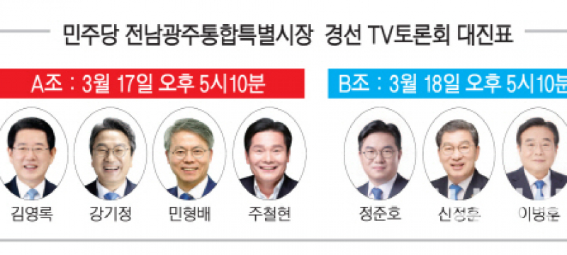 시·도 광역단체장에 다선 국회의원 ‘본경선 몸풀기’더불어민주당 전남광주통합특별시장 경선 토론 대진표가 확정된 가운데 현직 광주시장과 전남도지사(예비후보 등록 직무정지), 여론조사 1위 후보, 전남 동부권 대표 주자가 한 조에서 맞붙는 ‘빅매치’ 구도가 형성됐다. 유력 주자들이 한 조에 묶이면서 이번 경선 판세를 가늠할 첫 시험대가 될 것이라는 관측이 나온다. 통합특별시 출범 이후 지역 발전 전략과 광주·전...
