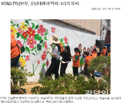 | KT&G 전남본부는 지난 6월 호남대학교 학생들과 함께 광산구 도산동 주민센터 인근 방울방울 골목길에 ‘밝은세상만들기 프로젝트’의 일환으로 ‘벽화그리기’를 진행했다. |