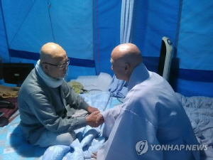 | 대한불교조계종 총무원장인 설정 스님(오른쪽)이 10일 오전 서울 조계사 옆 우정공원에서 21일째 단식 중인 설조 스님을 만나 단식 중단을 요청하고 있다. [조계종적폐청산시민연대 제공=연합뉴스] |