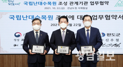 22일 전남도에 따르면 이날 도청에서 김영록 전남도지사, 최병암 산림청장, 신우철 완도군수, 윤재갑 국회의원 등이 참석한 가운데 ‘국립난대수목원 조성 업무협약’을 체결했다.