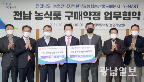 | 김영록 전라남도지사(국제농업박람회 이사장)가 28일 전남농업기술원에서 농협중앙회 농산물도매분사 석종수 분사장, 농협중앙회 전남지역본부 박서홍 본부장, 와이마트 김성진 회장과 농협중앙회, Y-MART(와이마트) 각 1천억 원, 총 2천억 원의 전라남도 농식품 구매약정을 체결하고 있다. |