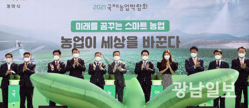 | 2021 국제농업박람회가 21일 오전 나주시 삼포면 전라남도농업기술원에서 열린 가운데 김영록 전라남도지사를 비롯해 김한종 도의회 의장, 장석웅 교육감, 김승남 국회의원, 강인규 나주시장, 배아현 홍보대사 등 참석자들이 개막을 알리는 퍼포먼스를 하고 있다. 박람회는 ‘미래를 꿈꾸는 스마트 농업’을 주제로 21일부터 31일까지 열린다. |