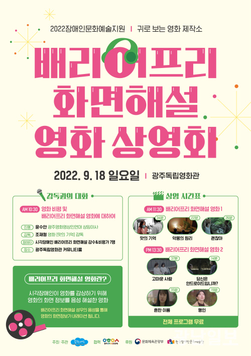 (사)광주영상영화인연대는 부산의 배리어프리 문화예술단체 꿈꾸는베프와 지역 교류를 통해 오는 18일 광주독립영화관에서 ‘배리어프리 화면해설 영화 상영회’를 연다.