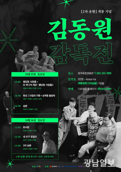 광주영화영상인연대는 오는 15일과 16일 광주독립영화관에서 ‘김동원 감독전’을 마련한다. ‘행당동 사람들’, ‘송환’, ‘내 친구 정일우’ 등 다큐멘터리 상영과 함께 GV행사를 진행한다.