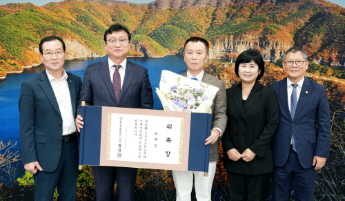 | 명창환 전남도 행정부지사가 7일 도청 접견실에서 윤재갑 신임 2025 전남국제수묵비엔날레 총감독에게 위촉장을 수여하고 기념촬영을 하고 있다. |