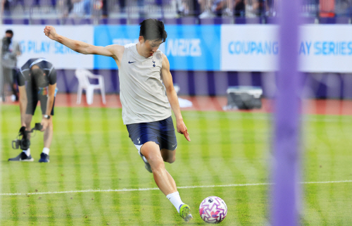 | 쿠팡플레이 시리즈 뉴캐슬과의 경기를 앞둔 토트넘의 손흥민이 2일 경기도 안양종합운동장에서 훈련하고 있다. 연합뉴스. |
