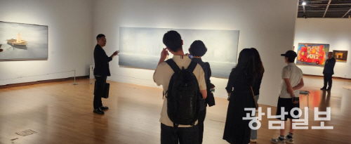 먼저 전시장 두번째로 배치된 교과서 수록작가인 정승원 작가는 평범한 하루의 단면들을 밝고 섬세한 시선으로 포착하며 삶 속 기억에 스며든 따뜻한 감성을 되살리며, 기억을 매개로 삶의 감각을 다시 일깨운다. 화면에 담긴 장면들은 독일 유학 시절의 일상, 가족과 함께 한 여름 날, 아쿠아리움을 찾았던 순간처럼 작가에게 익숙했던 풍경이 소재다. 독일 유학시절의 기억들을 투영된 작품들 역시 몰입시켰지만 그의 작품 ‘기억의 도시’는 그가 자라면서 경험했던 광주의 모습들이 원형의 작품에 투영됐다. 빽빽하게 들어찬 도심의 건축물 사이로 선로로 움직이는 경전차가 움직이고, 중외공원 팔각정과 증심사 일주문 등 시민들이 알만한 시설들이 작품 속에 재현돼 말 그대로 우리들의 일상을 재탐험하는 듯한 인상을 받을 수밖에 없었다.