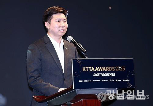 | 유승민 대한체육회장 당선인이 14일 서울 JW메리어트 동대문 스퀘어 서울호텔에서 열린 대한탁구협회 ‘KTTA 어워즈 2025’에서 축사를 하고 있다.연합뉴스 |