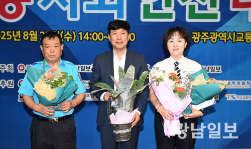 광주·전남지역 교통 사회안전문화 정착을 위해 27일 오후 광주교통문화연수원에서 열린 ‘제17회 광주·전남 교통·사회 안전 대축전’에서 교통안전부문 대상(손해보험협회장상)을 수상자. (왼쪽부터)나문갑 광주 광산모범운전자회 대의원, 안성준 손해보험협회 서부지역본부장, 윤은정 (사)광주서구 어린이안전학교 교통안전지도사.