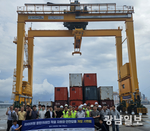 해양수산부와 해양수산과학기술진흥원은 최근 광양항 해양산업클러스터 내 테스트베드에서 에스엠에이치(SMH) 컨소시엄이 국책 연구개발사업으로 추진해온 ‘타이어형 항만 크레인 적용 자동화 안전모듈 개발 시연회’를 가졌다.