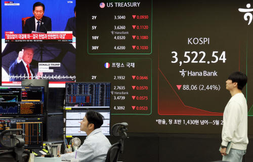 지수는 전장보다 60.52포인트(1.68%) 내린 3,550.08로 개장한 뒤 3.522.54까지 하락하다 차츰 낙폭을 줄여가는 중이다.