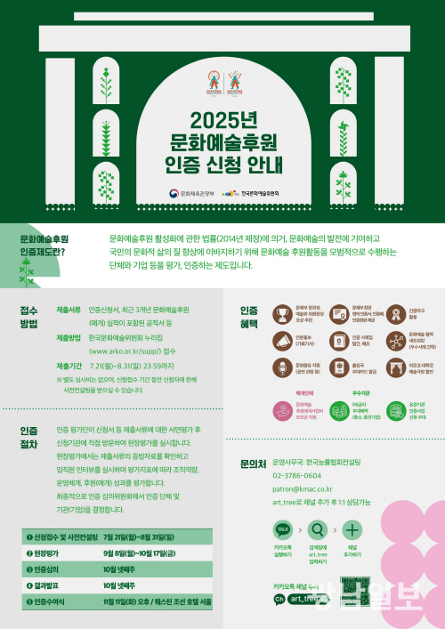 문화예술후원 인증 제도는 문화예술 후원 활성화를 위해 모범적인 후원활동을 수행하는 단체와 기업 등을 평가·인정하는 제도로, 조직역량. 후원 매개프로그램 개발 및 후원 유치 전략, 후원 성과 등의 활동 역량을 종합 평가해 선정한다.
