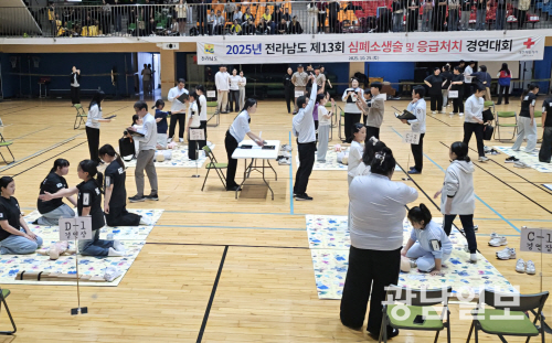 대한적십자사 광주전남지사는 지난 25일 전남 순천 청암고등학교 실내체육관에서 ‘제13회 심폐소생술 및 응급처치 경연대회’를 개최했다. 대회는 초등부, 중등부, 고등부, 대학일반부 등 총 64팀이 참여해 응급상황 속 대처 능력을 겨뤘다.
