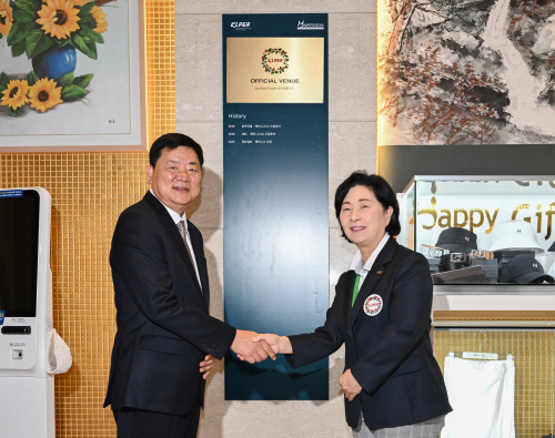 | 해피니스 컨트리클럽은 26일 클럽하우스에서 ‘KLPGA Official Venue’ 현판 제막식을 가졌다. 차재진 해피니스 컨트리클럽 대표와 김순희 KLPGA 수석부회장이 기념촬영을 하고 있다. |