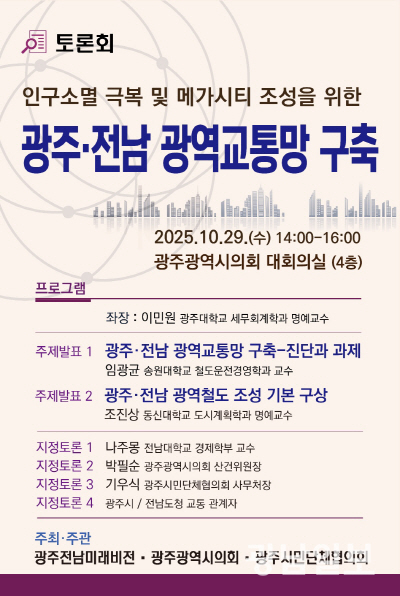 나주몽 전남대학교 경제학부 교수, 박필순 광주시의원, 기우식 광주시민단체협의회 사무처장, 그리고 광주시·전남도청 교통 관계자가 지정토론자로 참여해 광역철도·도로·대중교통 통합 추진 방안과 재정 현실성을 논의할 예정이다.