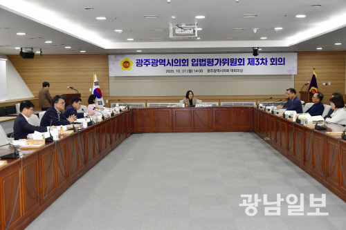 | 광주시의회는 27일 의회 대회의실에서 입법평가위원회 제3차 회의를 개최하고, 2025년도 입법평가 연구용역 최종보고회를 진행했다. |