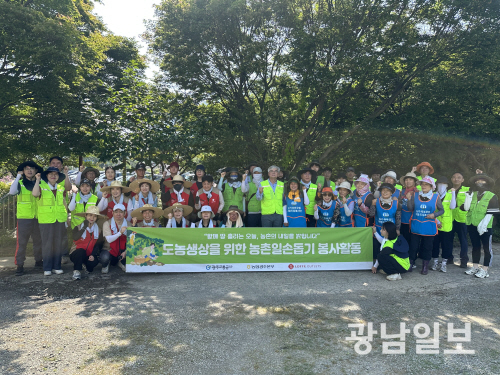 | 광주교통공사는 최근 롯데아울렛 광주수완점, 농협광주본부와 함께 광주시 북구 평촌마을 일대에서 농촌 일손 돕기 봉사활동을 펼쳤다. |
