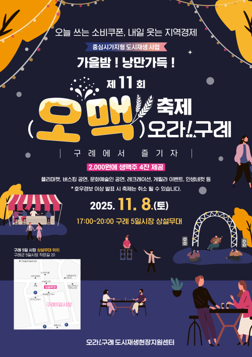 2일 구례군은 오는 8일 구례읍 5일시장 일원에서 ‘가을밤! 낭만가득!! 제11회 오맥축제 오라!구례’를 개최한다고 밝혔다.
