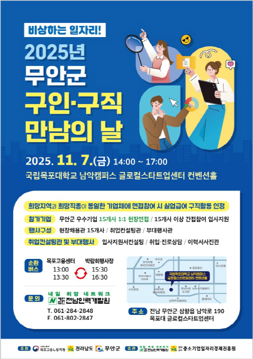 이혜향 무안군 미래성장과장은 “이번 행사는 구직자에게는 일자리 기회를, 기업에는 맞춤형 인재 채용의 장을 제공하는 의미 있는 자리다”며 “앞으로도 군민이 체감할 수 있는 현장 중심의 일자리 정책을 지속적으로 추진하겠다”고 말했다.