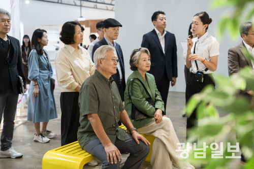 | 지난 9월 12일 광주디자인비엔날레를 방문한 문재인 전 대통령 내외가 2전시관을 감상하고 있다. |