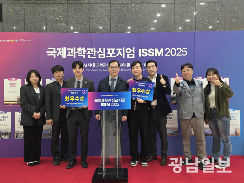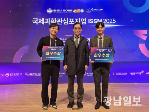 | 국립광주과학관(관장 이정구)은 최근 ‘2025 국제과학관심포지엄(ISSM) 학술대회’에서 2개 분야 과학기술정보통신부장관상(최우수상)을 수상했다. 사진은 제15회 국제과학관심포지엄 학술대회에서 수상한 김상우 연구원(왼쪽)과 이요한 행정원(오른쪽)이 이정구 관장과 기념사진을 촬영하고 있다. |