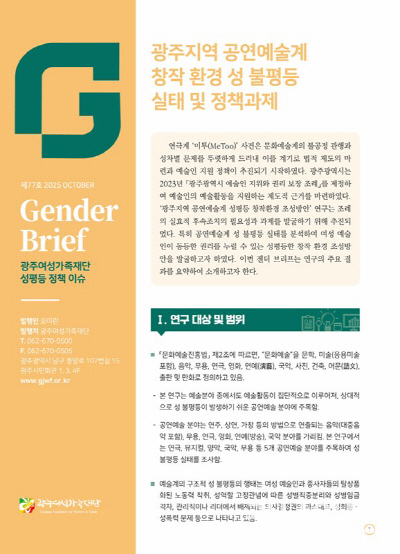 한편, 광주여성가족재단이 격월로 발간하는 ‘젠더브리프’는 성평등정책 이슈를 소개하는 간행물이다. 광주여성가족재단 홈페이지(www.gjwf.or.kr)에서 젠더브리프 제77호 전문을 확인할 수 있다.