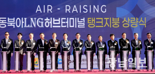 | 김영록 전남도지사가 5일 여수 묘도 LNG허브터미널 현장에서 열린 ‘LNG탱크지붕 상량식’ 행사에서 주요 내빈들과 상량식 세리머니를 하고 있다. 사진제공=전남도 |