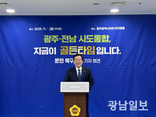 | 내년 지방선거 광주시장 출마를 준비 중인 문인 북구청장이 10일 광주시의회에서 기자회견을 갖고 “광주·전남 시·도 통합의 성패는 절박함과 속도에 달려 있다. 지금이 바로 통합의 적기”라고 밝혔다. |