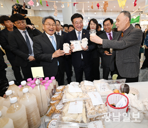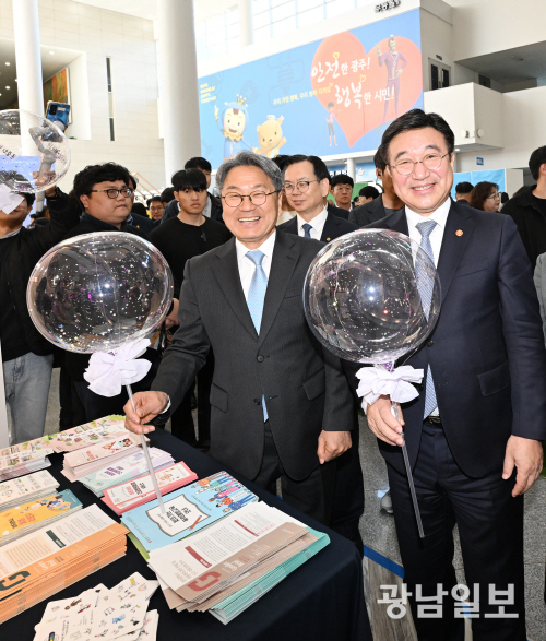 윤호중 행정안전부 장관이 10일 오전 광주시청 시민홀에서 열린 2025 광주 주민자치-공동체 한마당에서 강기정 광주시장및 내빈들과 함께 행사장을 둘러보고 있다.