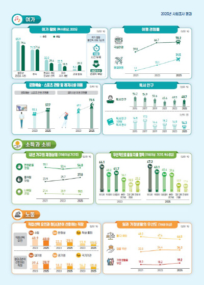 한편 사회조사는 10개 부문을 2년 주기로 매년 5개 부문씩 조사한다. 올해는 복지·사회참여·여가·소득과 소비·노동 부문이 포함됐다. 조사 기간은 지난 5월 14∼29일이다.