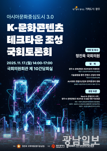 토론회는 이경주 광주정보문화산업진흥원장이 좌장을 맡았으며, 김승원 전남대 AI융합대학 교수와 김도현 ㈜지니소프트 대표가 토론자로 나서 광주 K-문화콘텐츠 테크타운 조성을 위한 자유토론을 진행한다.
