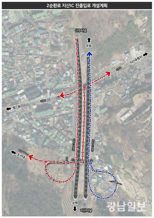 지산IC 진출로는 지산유원지 활성화와 무등산 관광객 및 시민의 교통편의 증진을 위해 민선 7기 때인 지난 2018년 9월 공사가 시작됐다.