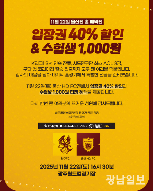 광주는 오는 22일 오후 4시 30분 광주월드컵경기장에서 열리는 하나은행 K리그1 2025 37라운드 울산HDFC전에서 홈 폐막전을 맞아 입장권 할인 이벤트를 실시한다.