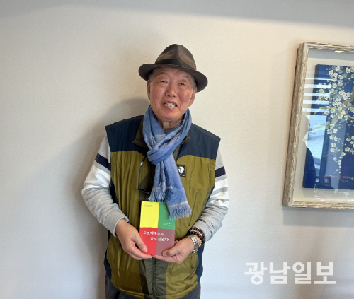 | 김준태 시인이 첫 소설집 ‘오르페우스는 죽지 않았다’를 들고 기념촬영에 응하고 있다. |