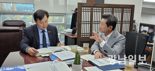 | 정인화 시장이 조계원 국회의원을 만나 사업설명을 하고 지원을 요청하고 있다. |
