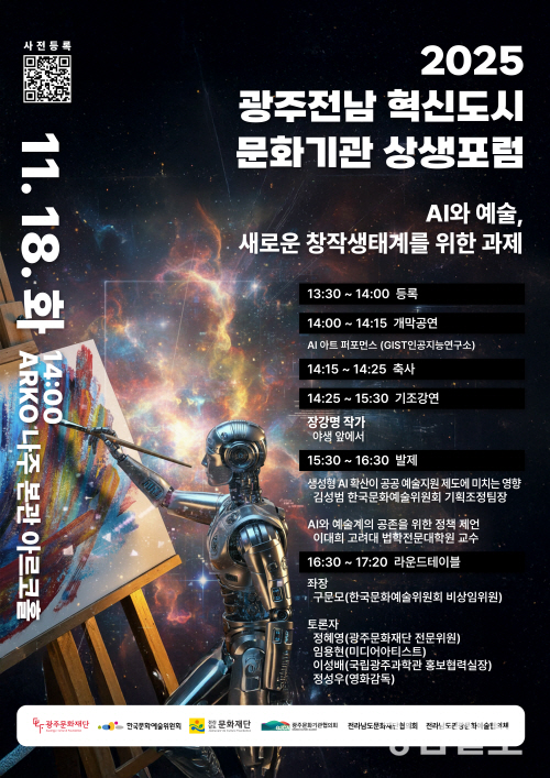 광주문화재단(직무대행 전은옥)과 한국문화예술위원회(arko·위원장 정병국), 전남문화재단(대표이사 김은영)은 오는 18일 한국문화예술위원회 나주 본관 아르코홀에서 ‘AI와 예술, 새로운 창작생태계를 위한 과제’를 주제로 광주전남 혁신도시 문화기관 상생포럼을 공동 개최한다.