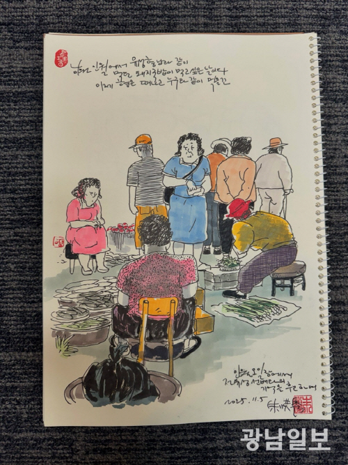 주 대표는 “모나미 볼펜 한 자루와 종이만 있으면 세계 어디를 가든 누구든지 친구가 될 수 있는 주홍수 작가를 광주에 모셨다. 잔잔한 위로를 건네는 그림들로, 그의 그림 속 한 사람 한 사람은 관객이 보는 순간 다정한 ‘우리’가 된다. 그림 속에서 말을 걸어오기 때문이다. 그가 백지에 볼펜으로 쓱쓱 그려가는 과정을 보고 있으면 5분만에 하나의 에피소드가 나타난다. 사람과 사람들이 어울려 살아가는 삶의 현장들이 아날로그 방식으로 다정하게 말을 걸어온다”며 “작가의 그림을 보며 그림 속에서 ‘우리’가 돼 삶의 재미와 맛을 느껴볼 수 있는 전시”라고 전했다.