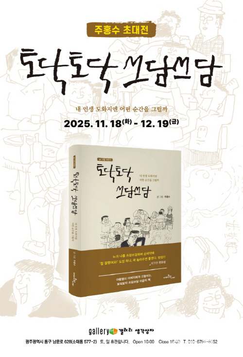 ‘어떻게 해서 전시를 유치하게 됐냐’는 질문에 대해 주홍 대표(갤러리 생각상자)는 이같이 답했다. 특별한 인연의 주인공은 전남 목포 출생 애니메이션 감독 주홍수씨가 그다. 주 감독은 18일부터 12월 19일까지 ‘토닥토닥 쓰담쓰담’이라는 타이틀로 개인초대전을 갖는다. 이번 전시는 주 감독의 광주에서의 첫번째로 마련된 자리다. ‘토닥토닥 쓰담쓰담’은 주 감독이 2021년 아마존의나비에서 출간한 단행본의 책 이름에서 차용했다. ‘토닥토닥 쓰담쓰담’은 스치듯 지나친 우리 삶을 기록한 그림 에세이집으로 이해하면 된다. 출품작은 삶의 스토리가 투영된 원화 150여점.