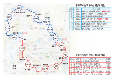 현재 1단계 구간은 서구와 남구지역 중심으로 공사가 진행 중이며, 토목공사 공정률은 1~6공구 92~99%를 기록했다.