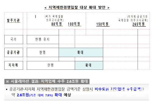 우선 정부는 공공기관(88억원 미만) 및 지자체(100억원 미만)의 지역제한경쟁입찰 기준을 기존 88억~100억원 미만에서 150억원 미만까지 확대하기로 했다. 정부 시뮬레이션에 따르면, 기준 상향 시 지역업체 수주 금액은 기존 대비 7.9%(약 2조6000억원) 늘어날 전망이다.