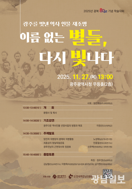 한국학호남진흥원은 오는 27일 오후 1시 광주시청 2층 무등홀에서 ‘이름 없는 별들, 다시 빛나다’라는 주제로 광복 80주년 기념 학술대회를 연다.