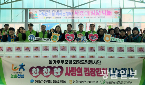 | 농협 전남본부와 고향주부모임 전남도지회, 농가주부모임 전남도연합회은 20일 해남군 계곡면에서 ‘사랑의 김장김치 나눔 행사’를 열고 지역의 어려운 이웃에 온정을 나눴다. |