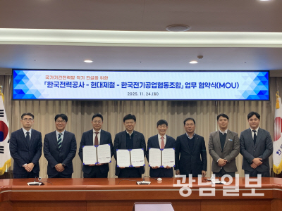 | 한국전력은 24일 광주전남공동혁신도시 본사에서 현대제철 및 한국전기공업협동조합과 ‘국가기간전력망 적기 건설’을 위한 업무협약을 체결했다. |