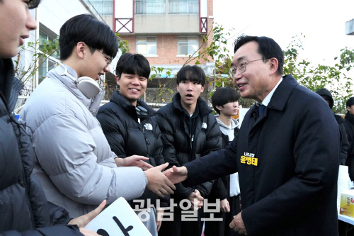 | 윤병태 나주시장이 2026학년도 수학능력 시험일인 11월 13일 오전 수험생 선배들을 응원하고 있는 학생들을 격려하고 있다. |