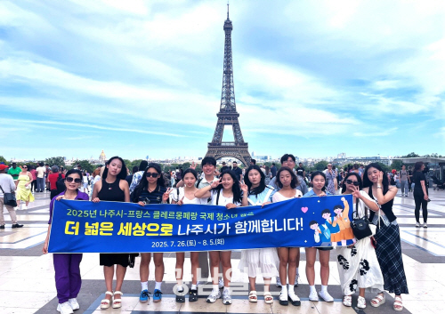 | 지난 7월 26일부터 8월 5일까지 프랑스에서 열린 ‘프랑스 국제 청소년 여름캠프’에 참가한 나주 지역 고등학생들이 에펠탑 앞에서 기념 촬영을 하고 있다. |