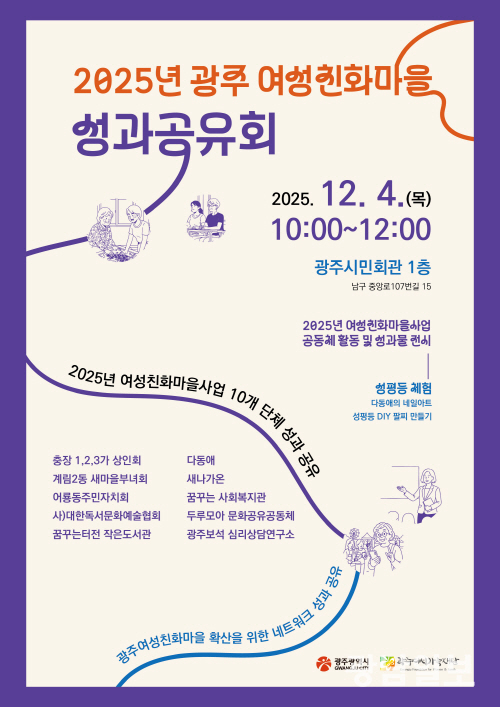 광주여성가족재단은 오는 12월 4일 오전 10시 광주시민회관 1층 공유공간에서 ‘2025년 광주 여성친화마을사업 성과공유회’를 갖는다.