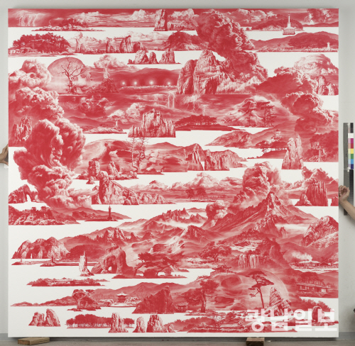 이 작가는 전통 산수화의 부감 시점과 능선의 흐름 등 산수 구도를 현대적으로 변용해 자연의 재현이 아닌 전쟁·상실·분단·역사적 기억이 층위처럼 쌓인 ‘기억의 산수’를 구축해왔으며, 그의 붉은 풍경은 군 복무 시절 야간투시경을 통해 본 비현실적 장면, 아름다움과 실존적 두려움이 동시에 존재했던 풍경에서 출발해 현대사의 상흔을 붉은색 하나로 응축한 독창적 회화 세계로 주목을 받아왔다.