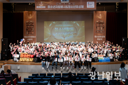 | 광주북구청소년수련관(관장 강병길)은 지난 29일 광주청소년수련원 극장에서 열린 ‘2025년 광주청소년자원봉사대회’에서 청소년운영위원회 ‘하울림’ 소속 황서진(광주여대)과 이자영(전남여상) 위원이 성평등가족부장관상을 수상했다. 사진은 광주북구청소년수련관 봉사대회 기념사진. |
