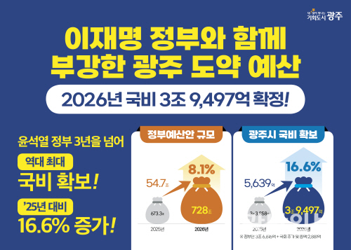 광주시는 지난 2일 국회 본회의를 통과한 ‘2026년도 정부 예산’에서 광주지역 예산 3조9497억원이 반영됐다고 3일 밝혔다.