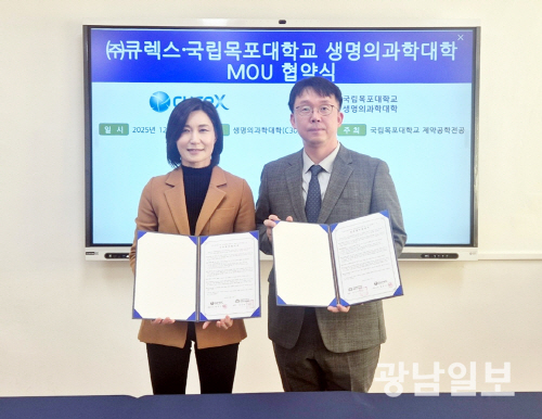 | 국립목포대학교 전경숙 생명·의과학대학장은 최근 R&D 실무 역량 강화 및 산학협력 기반 전문인력 양성을 위해 바이오벤처기업 ㈜큐렉스 최성식 대표와 업무협약(MOU)을 체결했다. |